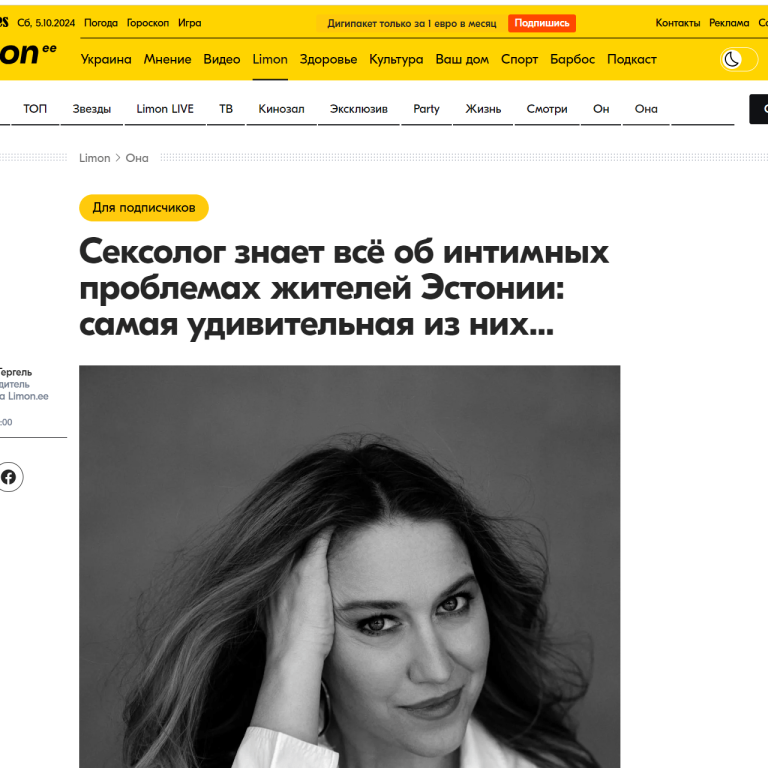 СМИ Сексологические проблемы в Эстонии: удивительные факты Недавно я поделилась опытом о самых распространённых интимных проблемах жителей Эстонии в интервью для Postimees. В статье мы … by Ольга ЗубковаOctober 5, 2024