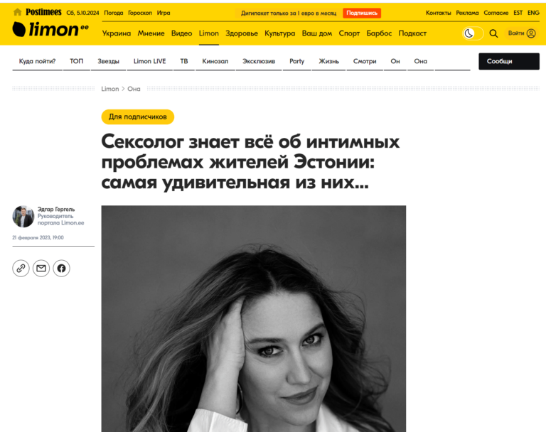 Недавно я поделилась опытом о самых распространённых интимных проблемах жителей Эстонии в интервью для Postimees. В статье мы обсудили такие вопросы, как мужская зависимость от порнографии и женские измены. Самый неожиданный факт, который я заметила в своей практике, – это тревоги мужчин по поводу изменений их телосложения.